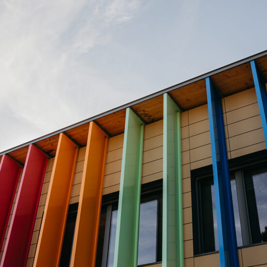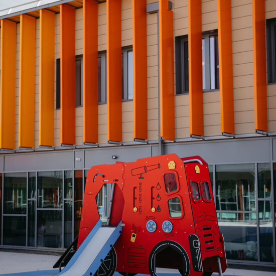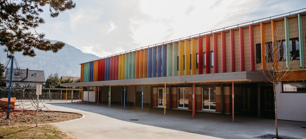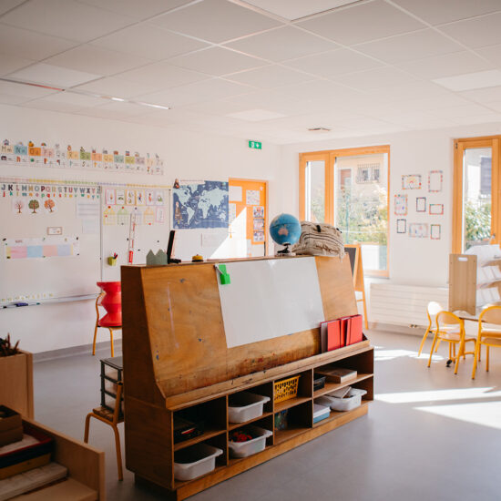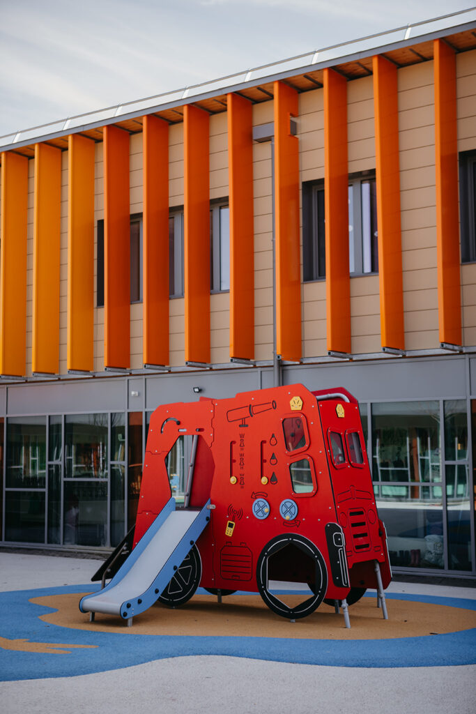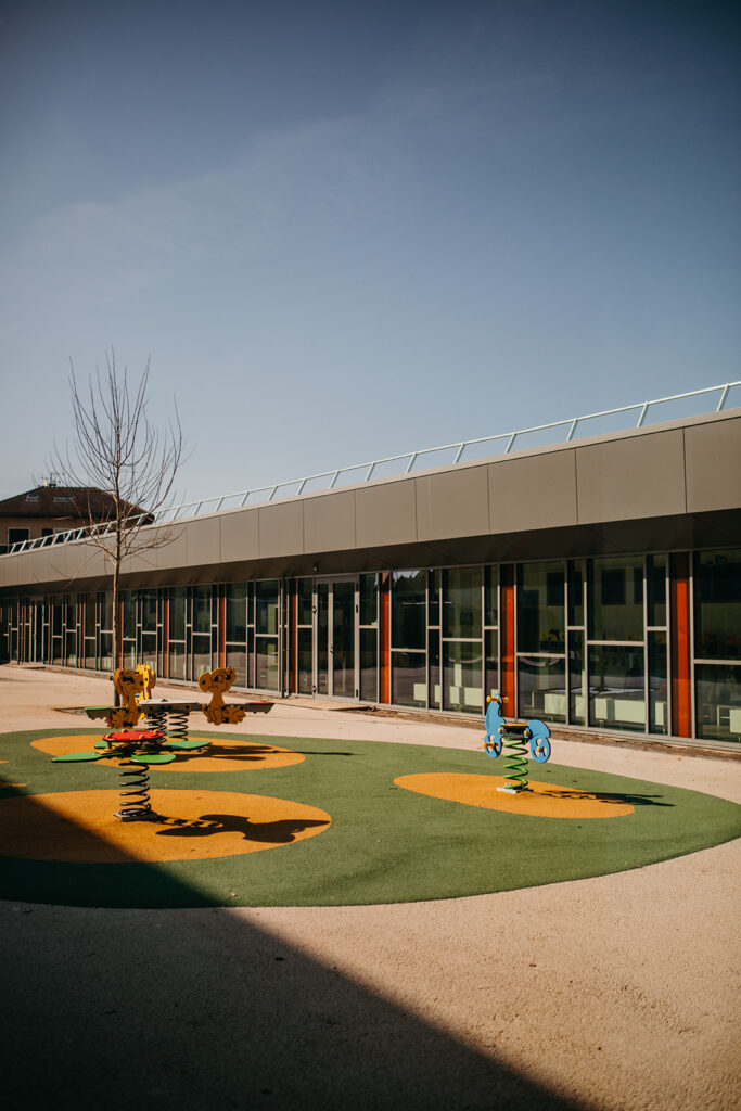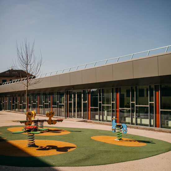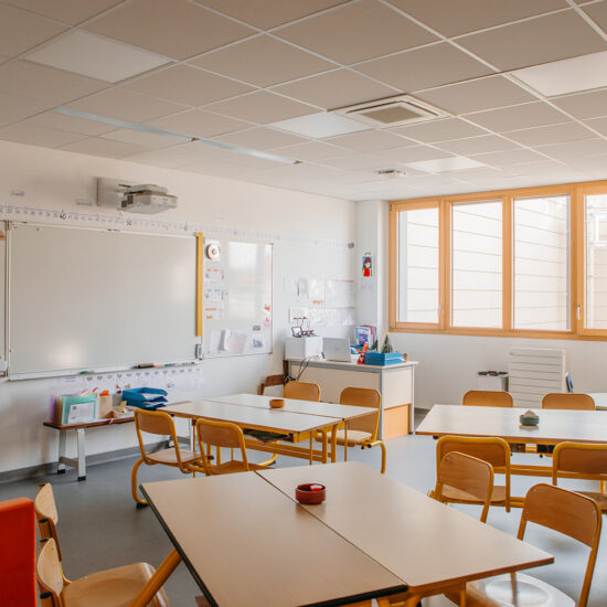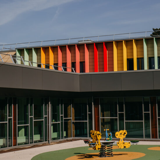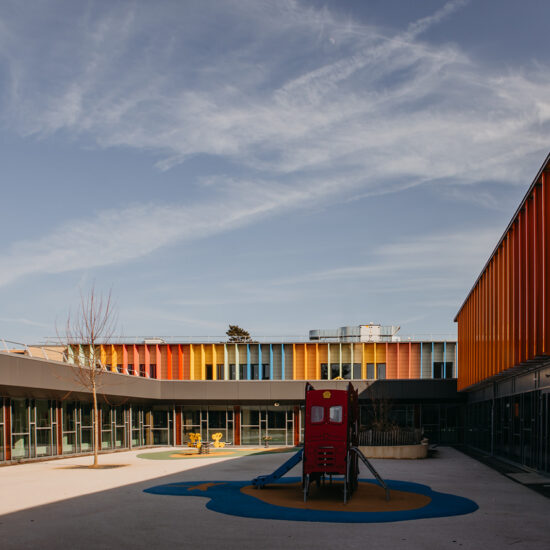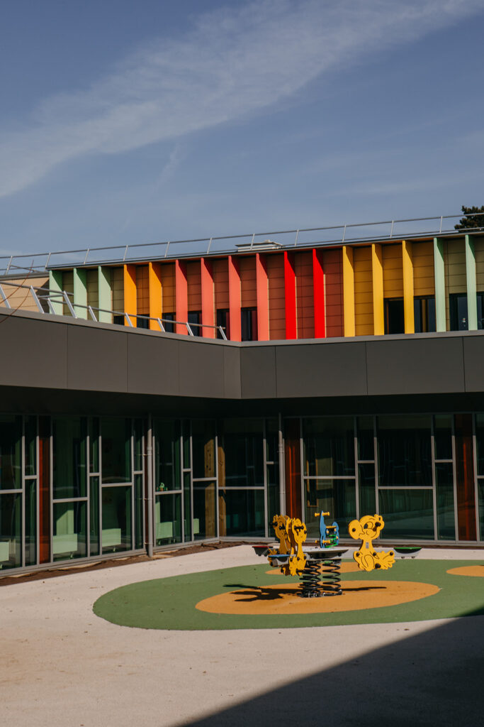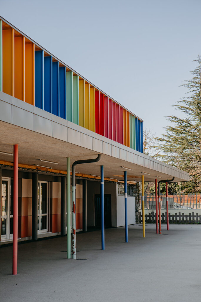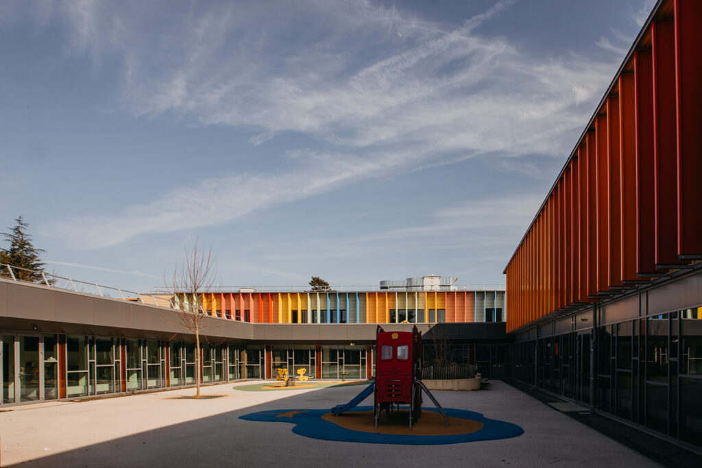Les accès et les cours de récréation ont été entièrement remaniées, intégrant éléments pédagogique et écologiques tels que îlots de fraicheur, noue paysagère, jeux et assises.