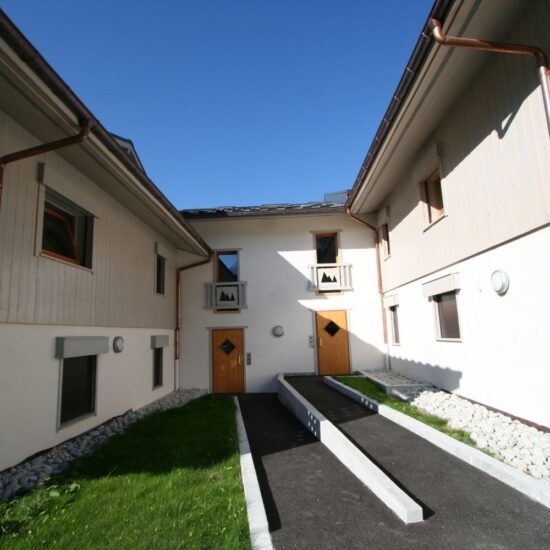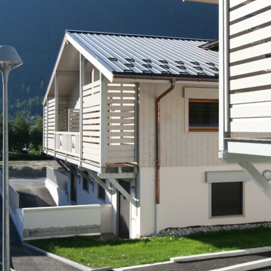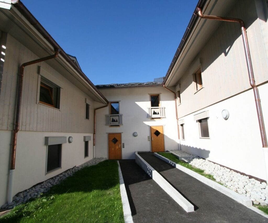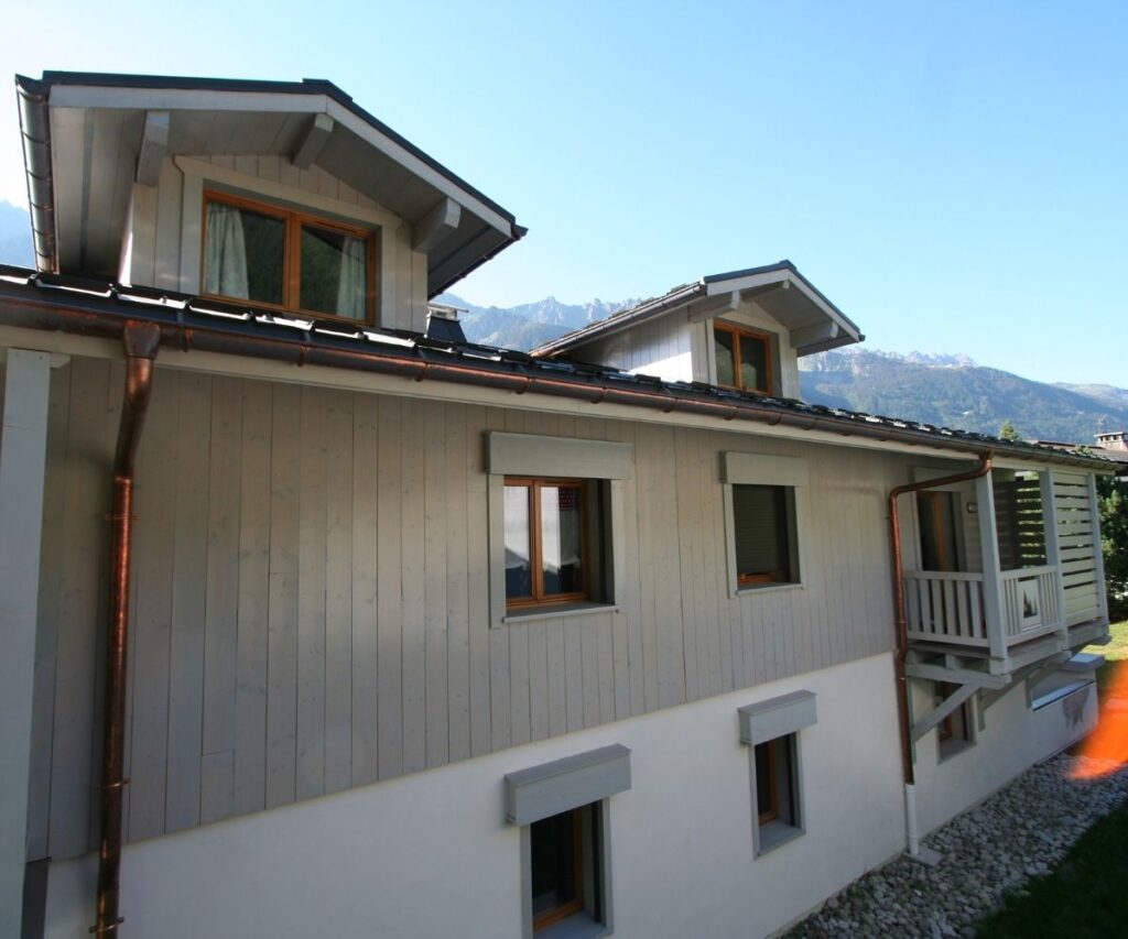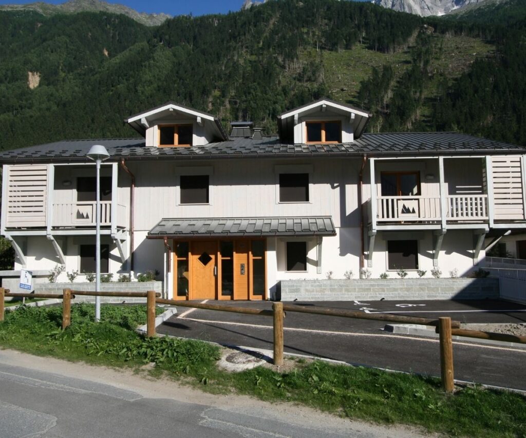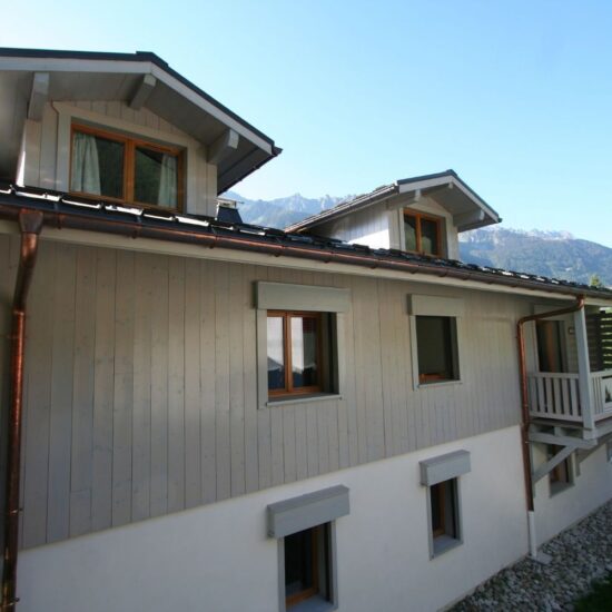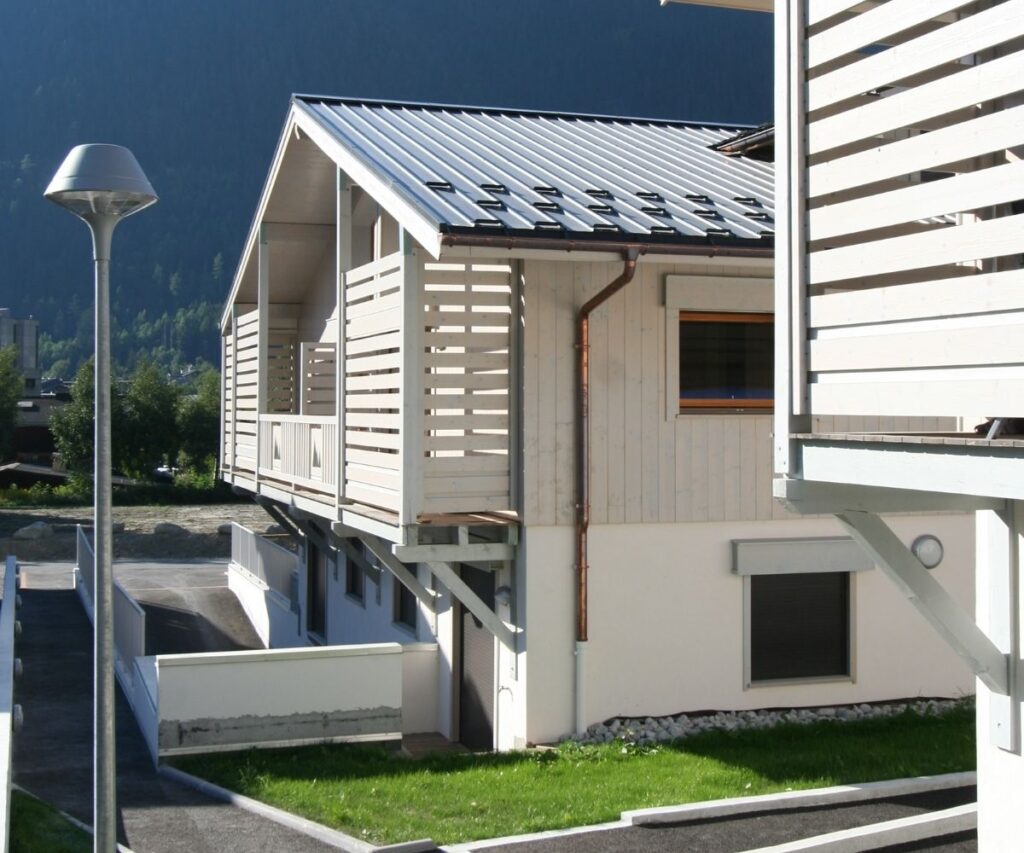 Le projet s’inscrit dans une zone moyennement urbanisée sans structure forte, dont la route du Rosay reste le seul axe marquant. Dans ce contexte, nous avons réalisé l’assemblage de petits bâtiments de 7 logements au plus, plutôt que de gros « ensembles». Ces bâtiments sont proches les uns des autres comme dans les hameaux ou les bâtiments de fermes. Leur volumétrie et leur architecture sont simples. Leur hauteur absolue est limitée. Une rue et une place le long ou autour desquels se développe le projet. Des espaces libres et aérés, des passages réservés aux piétons, la plupart des places de stationnement étant concentrées dans le parking souterrain ou en façade nord du terrain. Une adaptation simple à la pente, sans accès en tranchée, sans murs de soutènement importants. Des bâtiments orientés afin de leur préserver au mieux la vue sur le massif du Mont-Blanc. Un verger dans l’esprit du verger préexistant au projet.