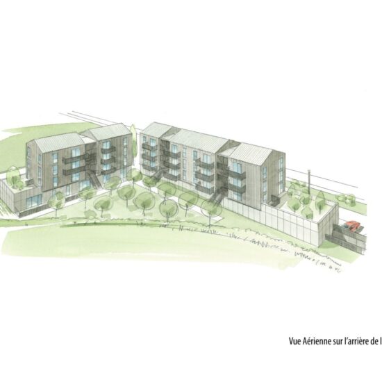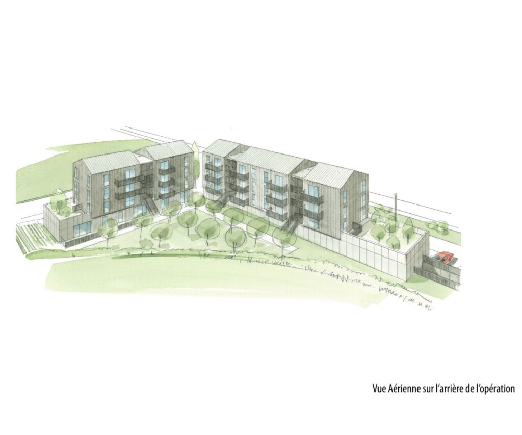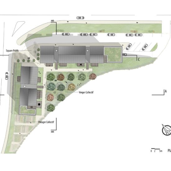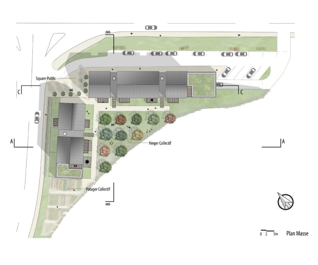 Cette forme urbaine permet la clôture totale du terrain ainsi qu’une délimitation claire entre les espaces publics et privés. Les espaces résultants de cette disposition sont aménagés afin de rendre le cadre de vie plus agréable : un verger et un potager collectif sont créés en cœur d’ilot alors qu’une placette minérale publique trouve sa place à l’articulation des deux bâtiments.