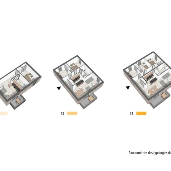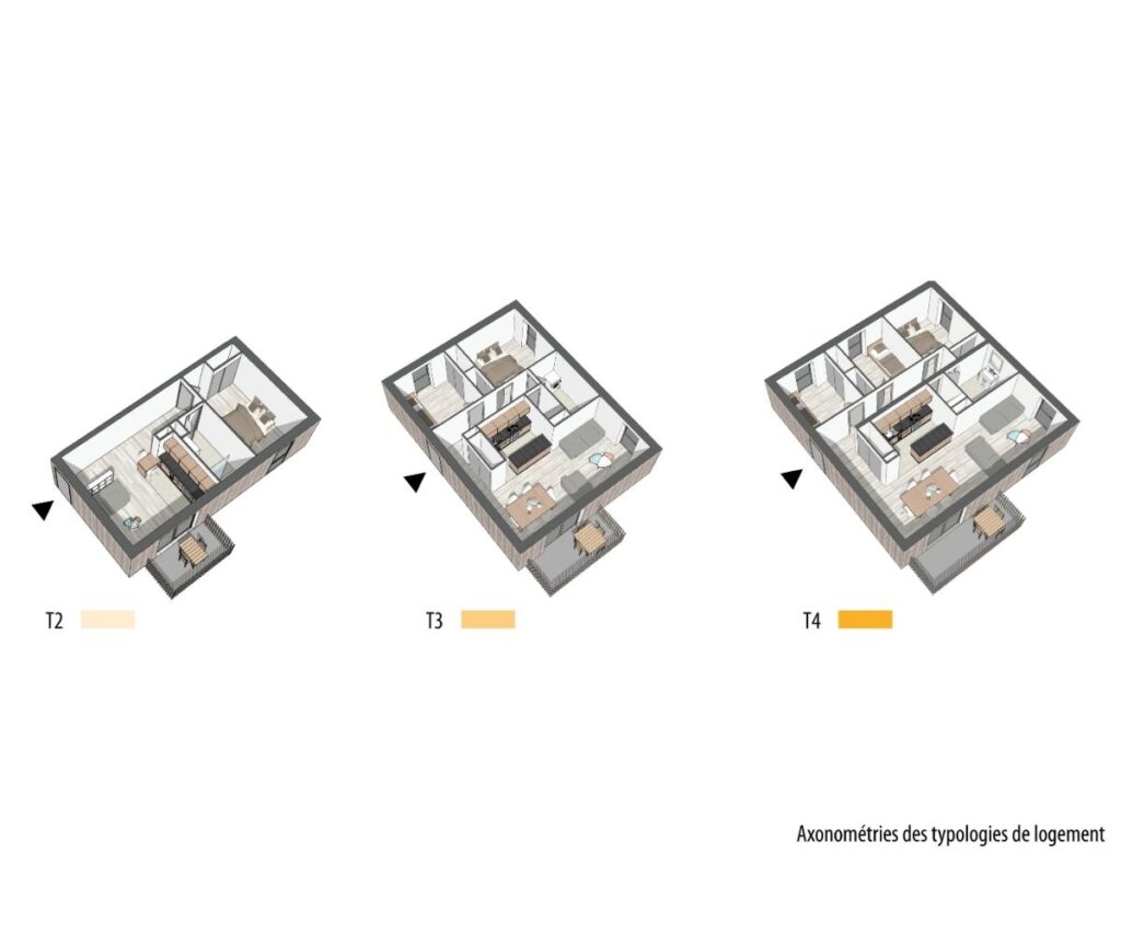 Les logements sont quant à eux disposés sur trois niveaux. Ils sont tous traversant avec l’espace nuit côté rue et l’espace jour côté jardin collectif. L’orientation du bâtiment permet de faire bénéficier à tous d’une terrasse au Sud.