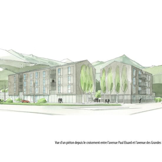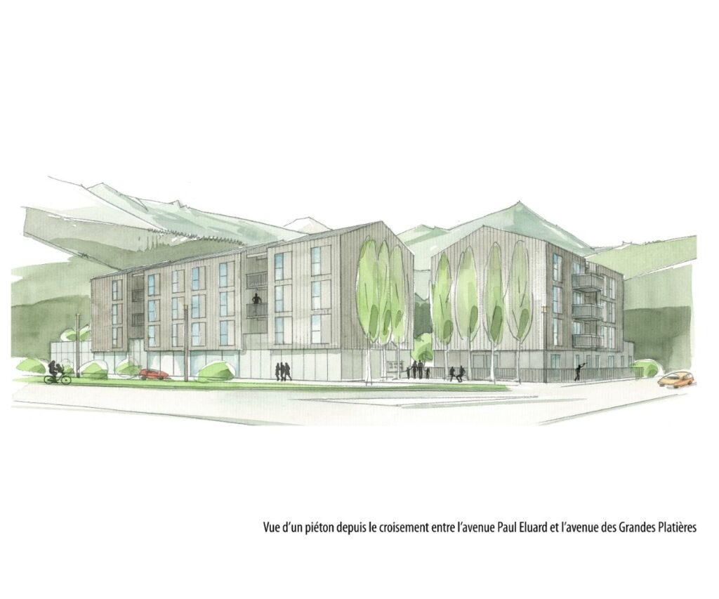 Le parti pris lors de l’élaboration de ce projet a été de constituer deux entités bâties parallèles aux deux avenues bordant le terrain d’implantation.