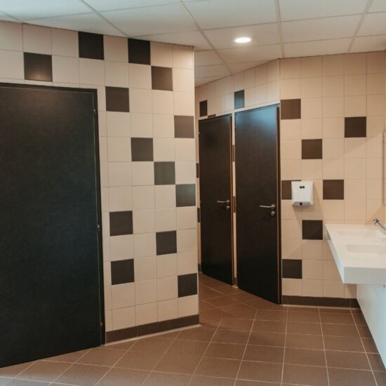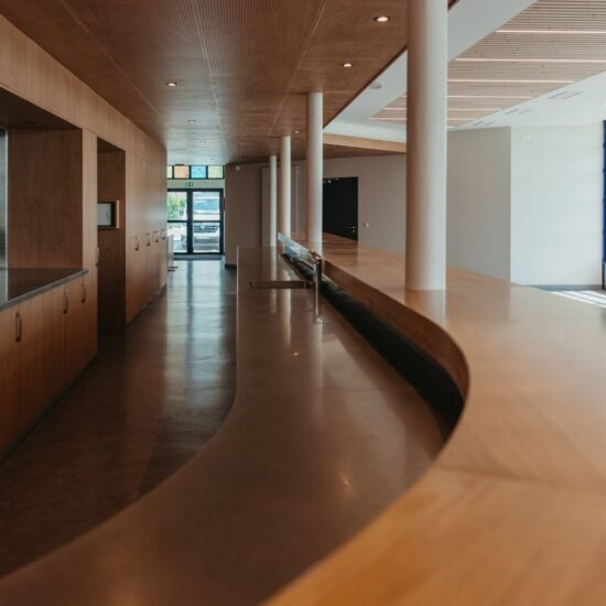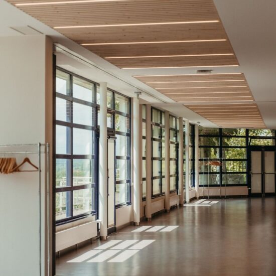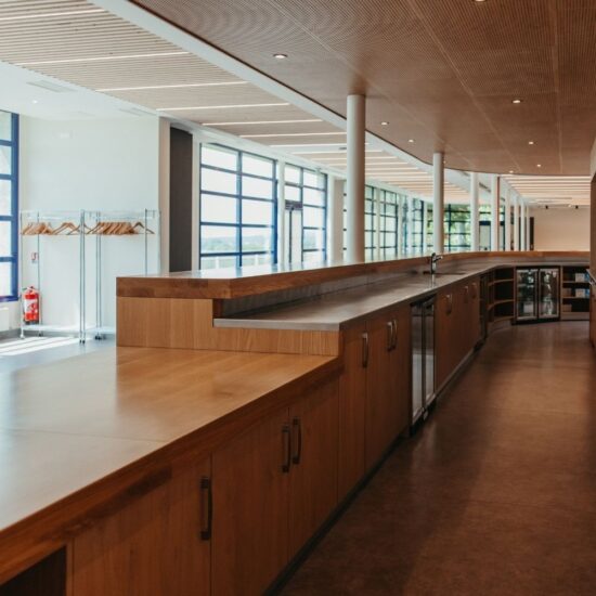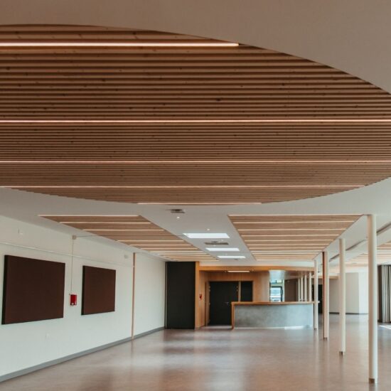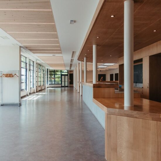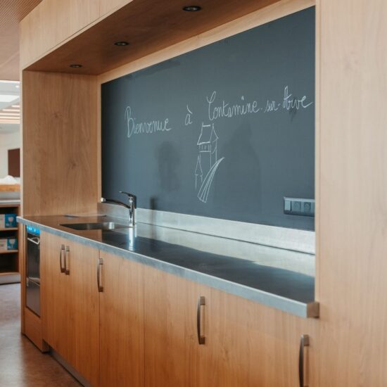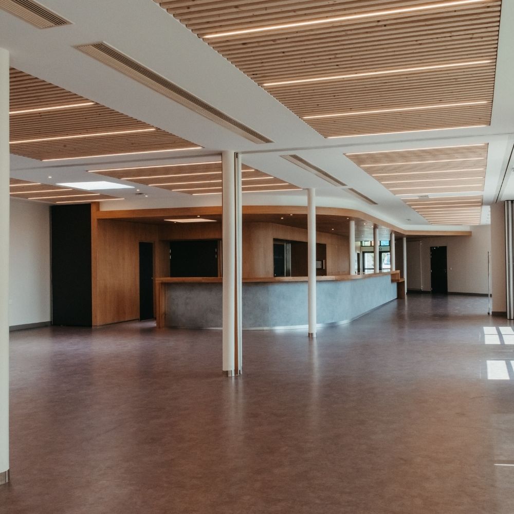 La commune souhaitait retravailler les espaces intérieures de sa salle polyvalente afin de retrouver un espace bar ouvert. L’espace d’entrée et l’espace sanitaires a également été remanié.