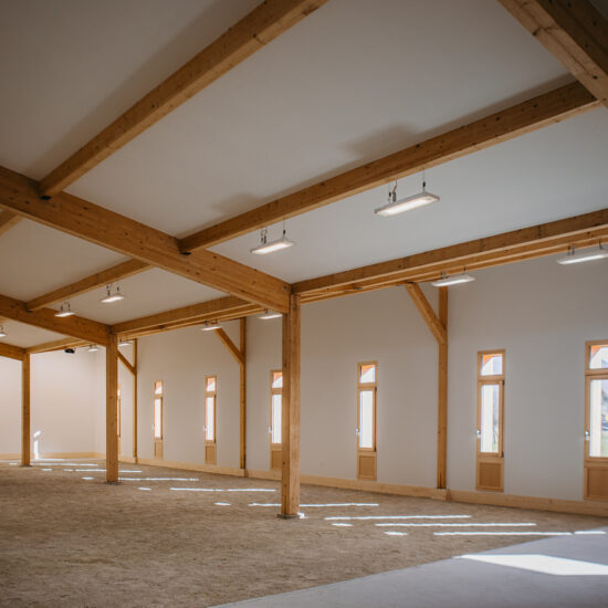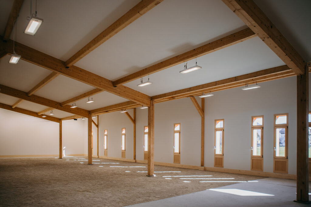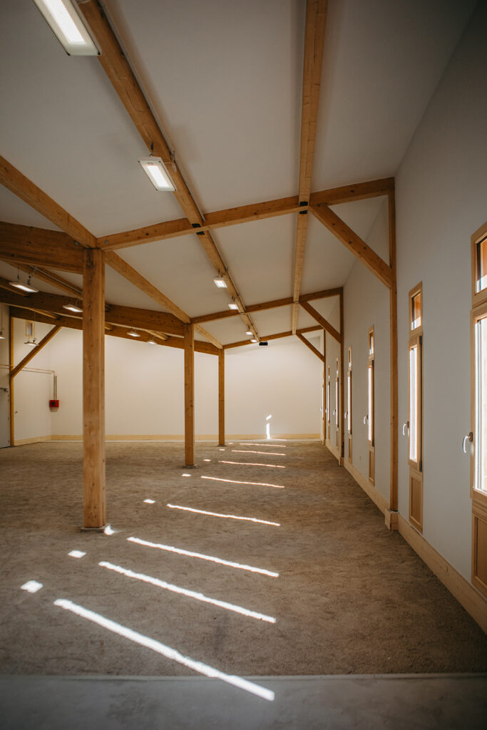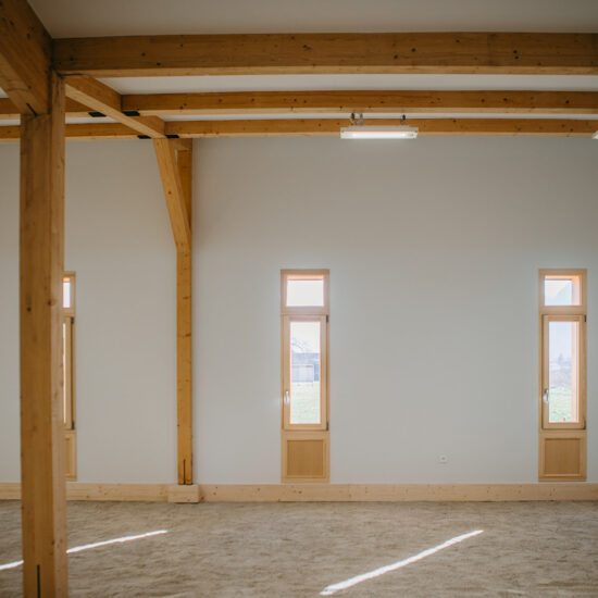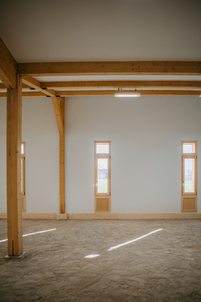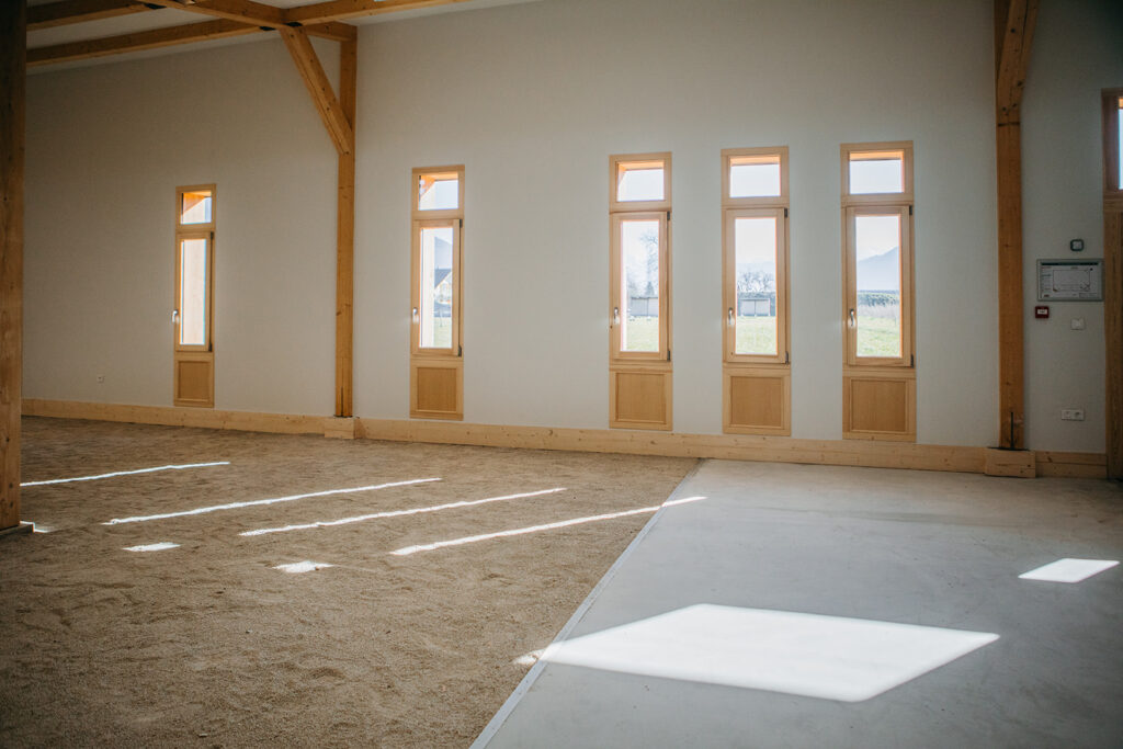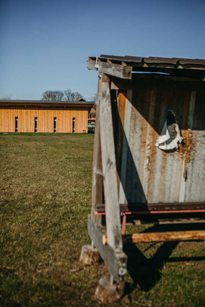 Une extension a été créée afin de permettre la pratique du tir à l’arc en intérieur. Le volume situé entre la zone de tir et les cibles a été traité en sable afin de permettre de diversifier l’usage du bâtiment et d’accueillir les pratiquants de la pétanque.